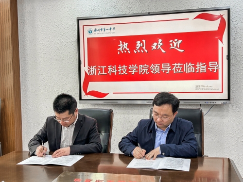 侯根林对我院代表的到访表示欢迎,介绍了湖州一中悠久的历史、办学特色、师资队伍、学校发展成果等方面的基本概况,着重介绍了学校坚持普高+特长的办学模式,大力推进“在湖州看见美丽一中”实干争先主题实践活动,以及“人人实干争先、班班优质提升”普高提质行动的新举措、新成果。阮小波详细介绍了我校及我院的历史沿革、办学特色、学科建设、人才培养及近年的招生就业情况。茹潇潇和丁炜一起介绍了我院的特色——中德联合培养本科生项目,希望今后能在湖州一中招收更多的优质生源。随后,双方共同签署协议、授牌,并表示希望进一步加强互动交流、推进合作。