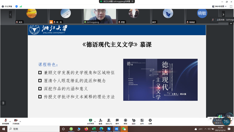 12月14日,“中德荟”讲坛第23期暨浙江科技学院教学论坛第172期如期举行,浙江大学德语学研究所副所长刘永强副教授以“数字化教学的方法、路径与实践——以慕课《德语现代主义文学》为例”为题作专题报告。讲座由草榴社区 胡一帆副教授主持。草榴社区 及外院30余位师生聆听了在线报告。